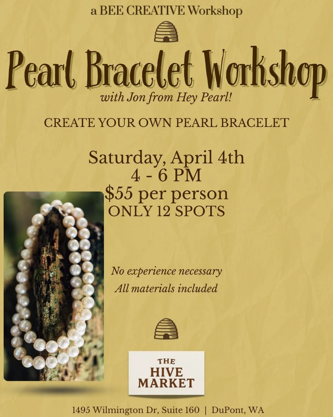 Join us at The Hive Market for a hands-on pearl bracelet workshop with Jon from Hey Pearl! where you’ll make your own custom bracelet—no experience needed.
