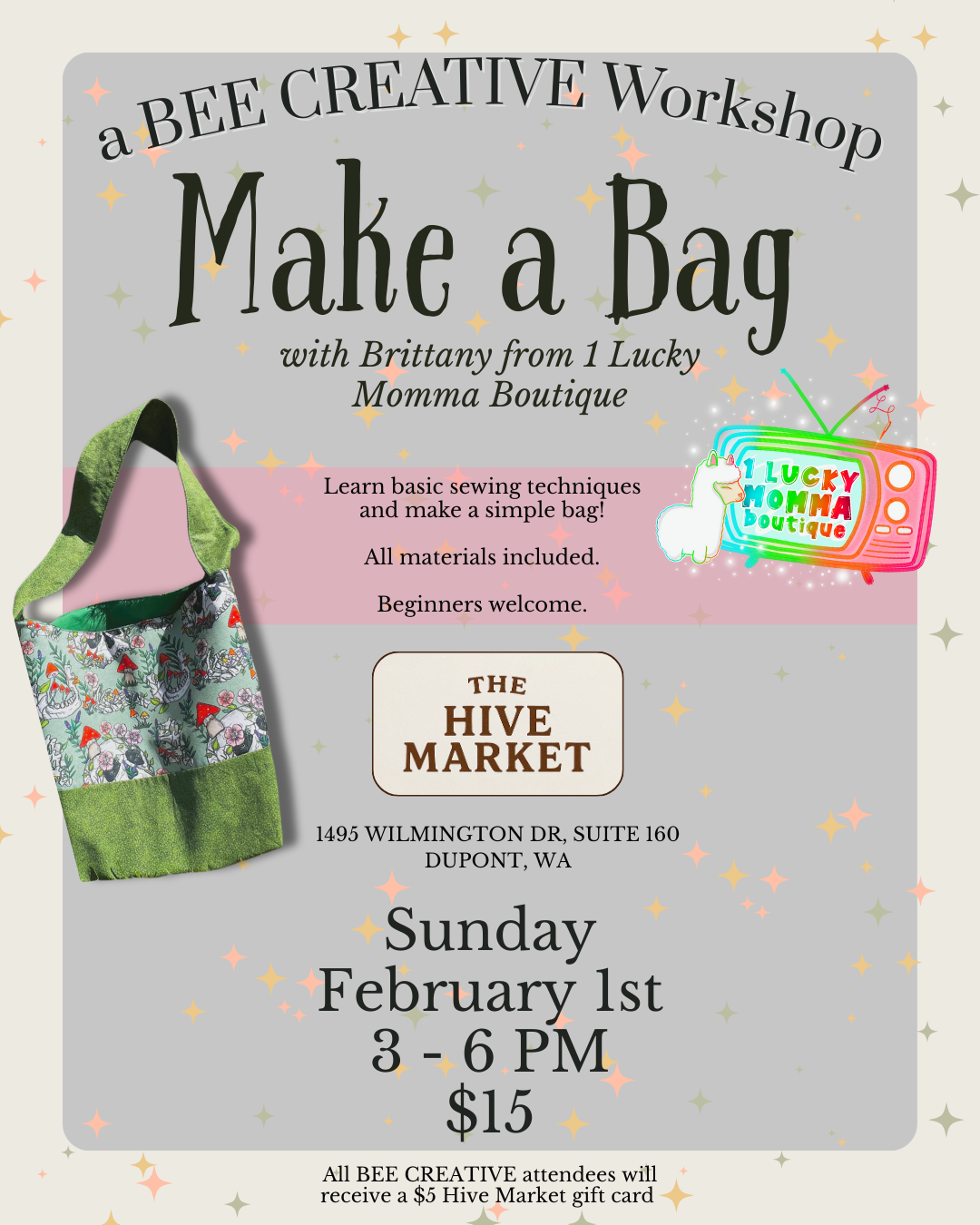 Learn the basics of sewing while creating a functional fabric tote in this beginner-friendly workshop. Attendees will be guided through each step and leave with a finished bag and new sewing confidence.