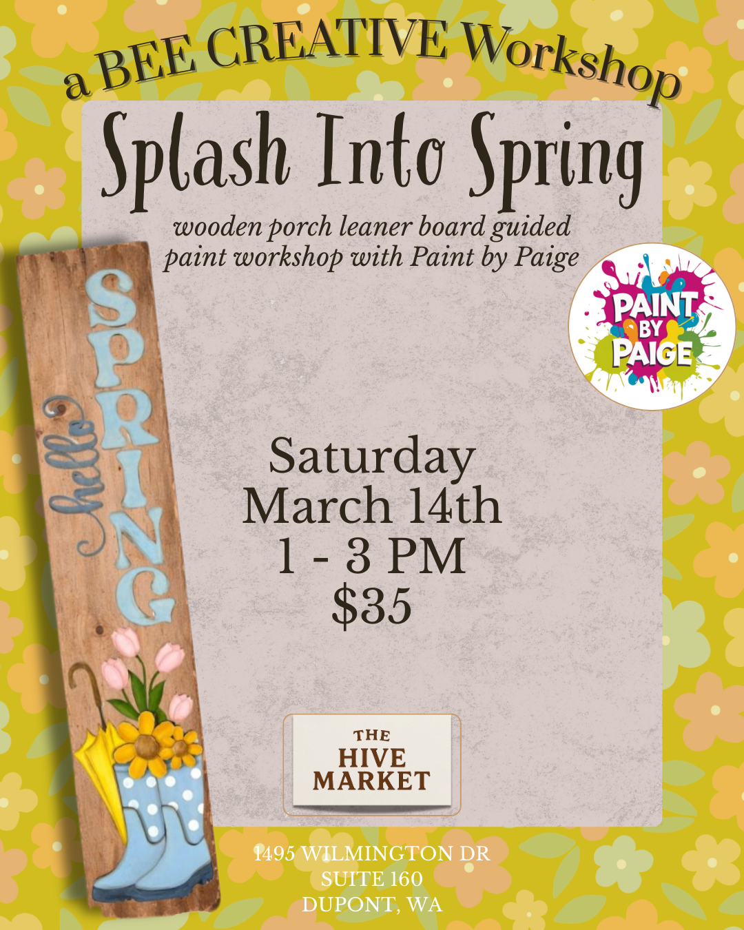 Celebrate the season with a fun, hands-on painting workshop and create a cheerful “Splash Into Spring” wood porch leaner to brighten your entryway. In this beginner-friendly class, you’ll paint a tall wooden sign featuring colorful rain boots filled with fresh spring flowers. Paige from Paint by Paige will guide you step by step, making it easy and enjoyable—no experience needed. All supplies are included, and you’ll leave with a finished porch leaner ready to welcome the new season. What’s included: Pre-cut wooden porch leaner board All paints, brushes, and supplies Step-by-step instruction A completed spring-themed porch sign painted by you! Perfect for: Spring home décor lovers Friends’ day out Creative self-care time Seats are limited—reserve your spot and splash into spring with us.